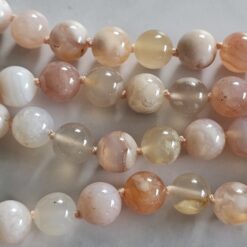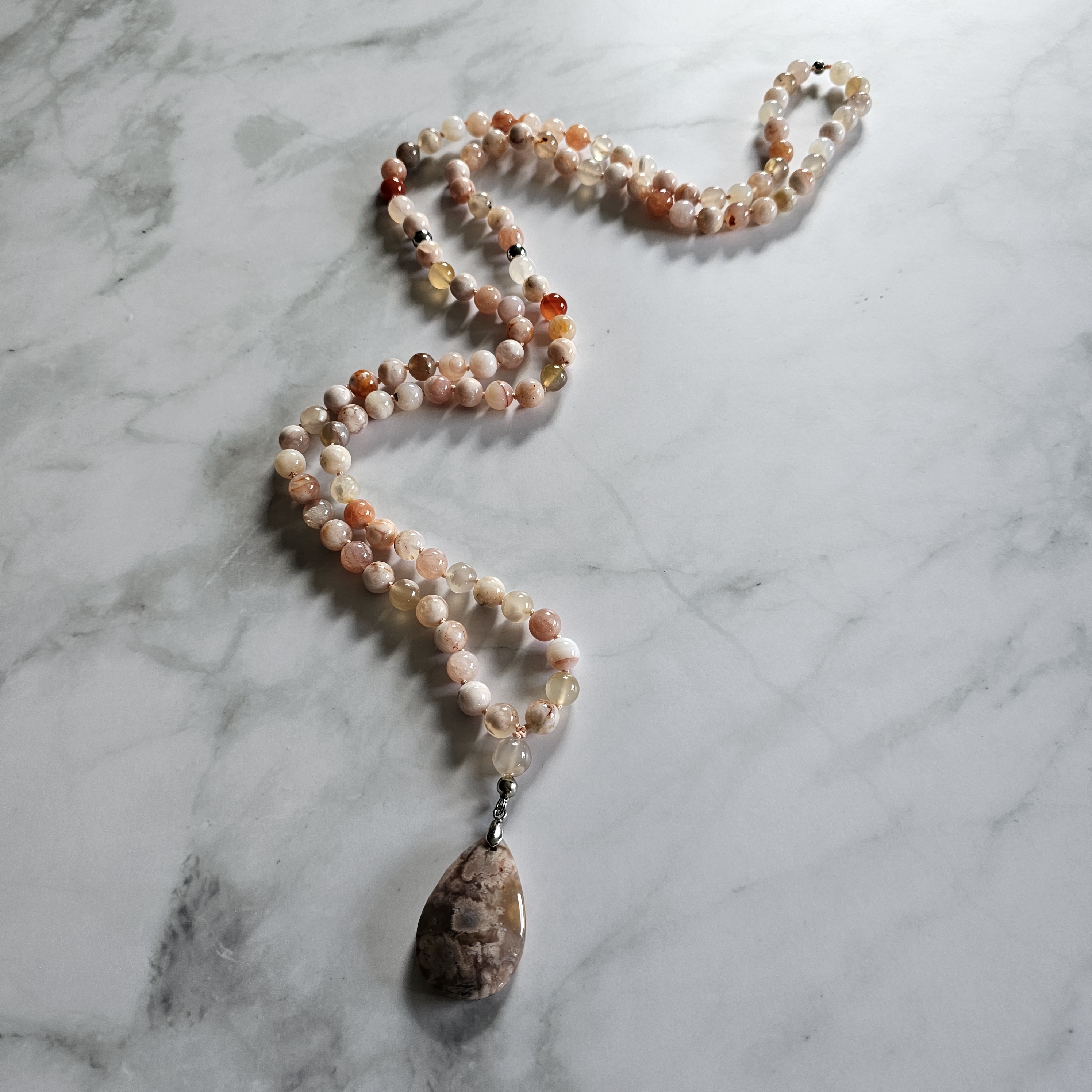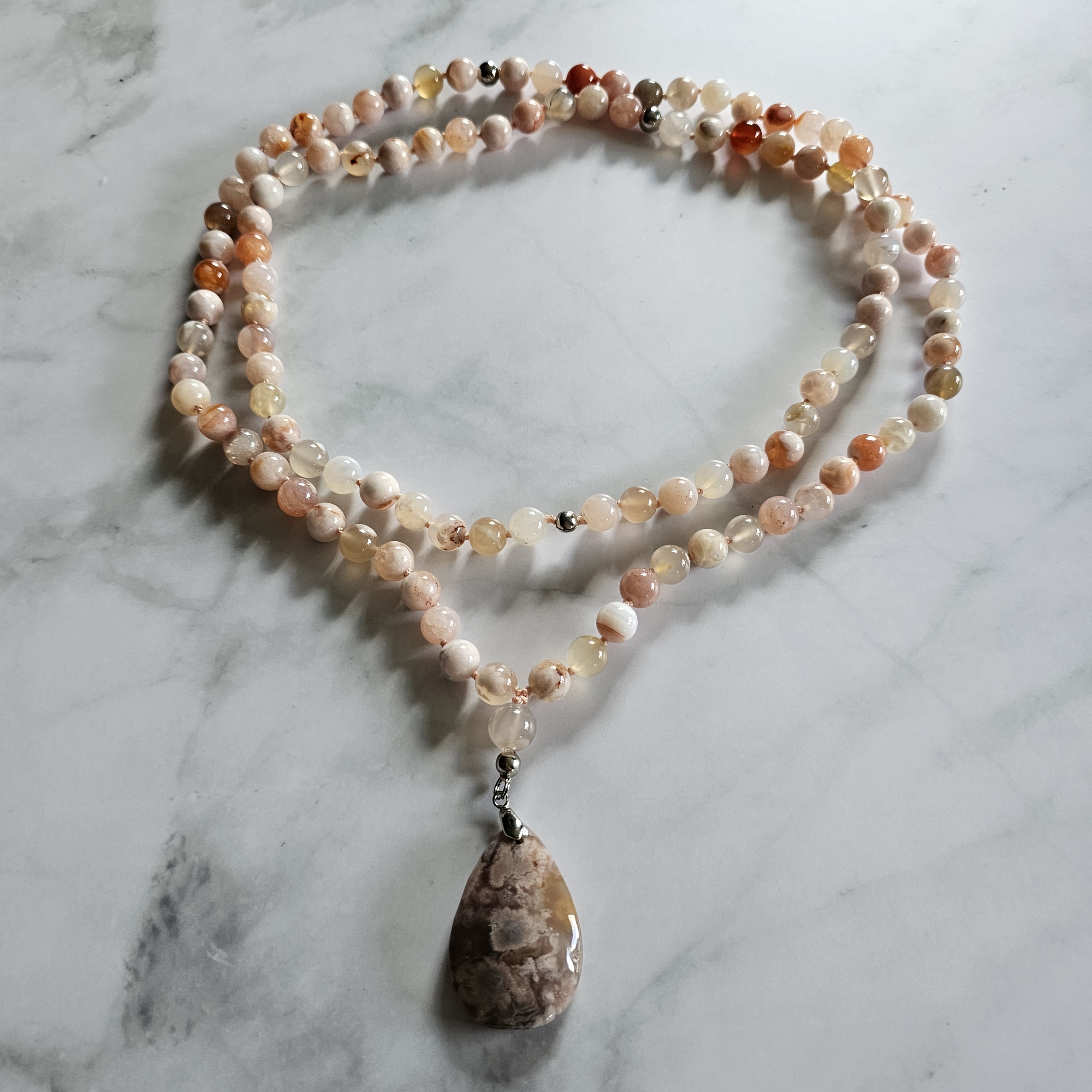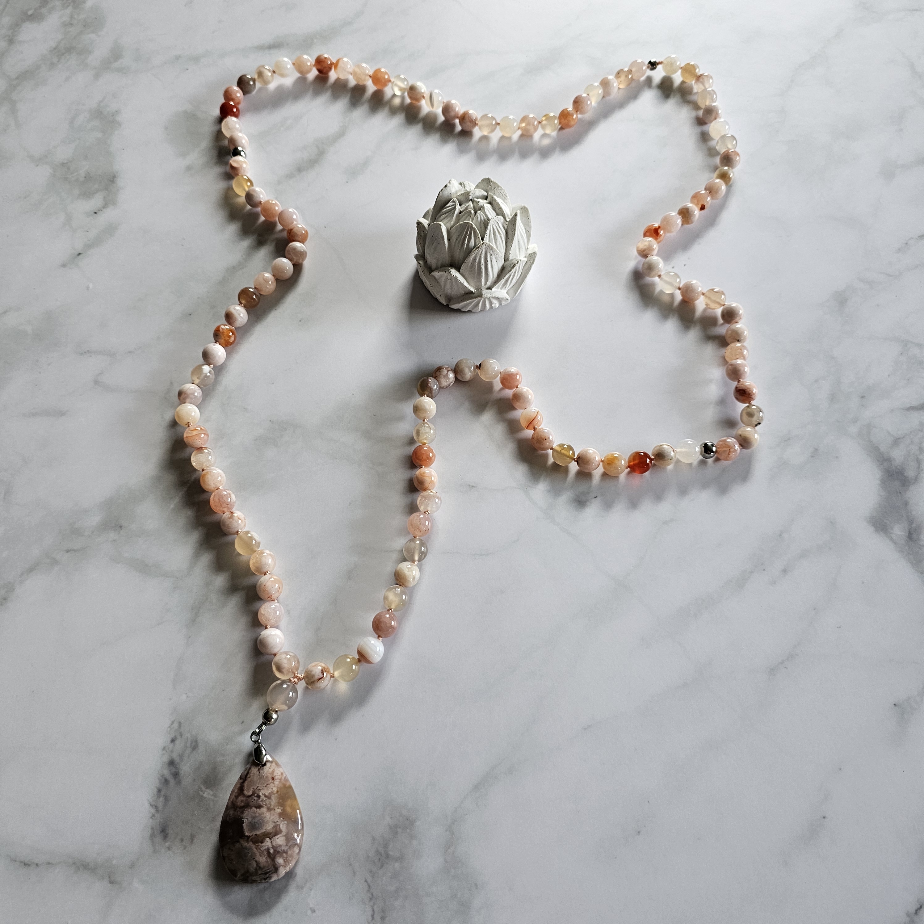 Hier biete ich euch die Achat („Kirschblütenachat“) -Mala (1) mit einem „Kirschblütenachat“-Anhänger (Tropfen) an:
