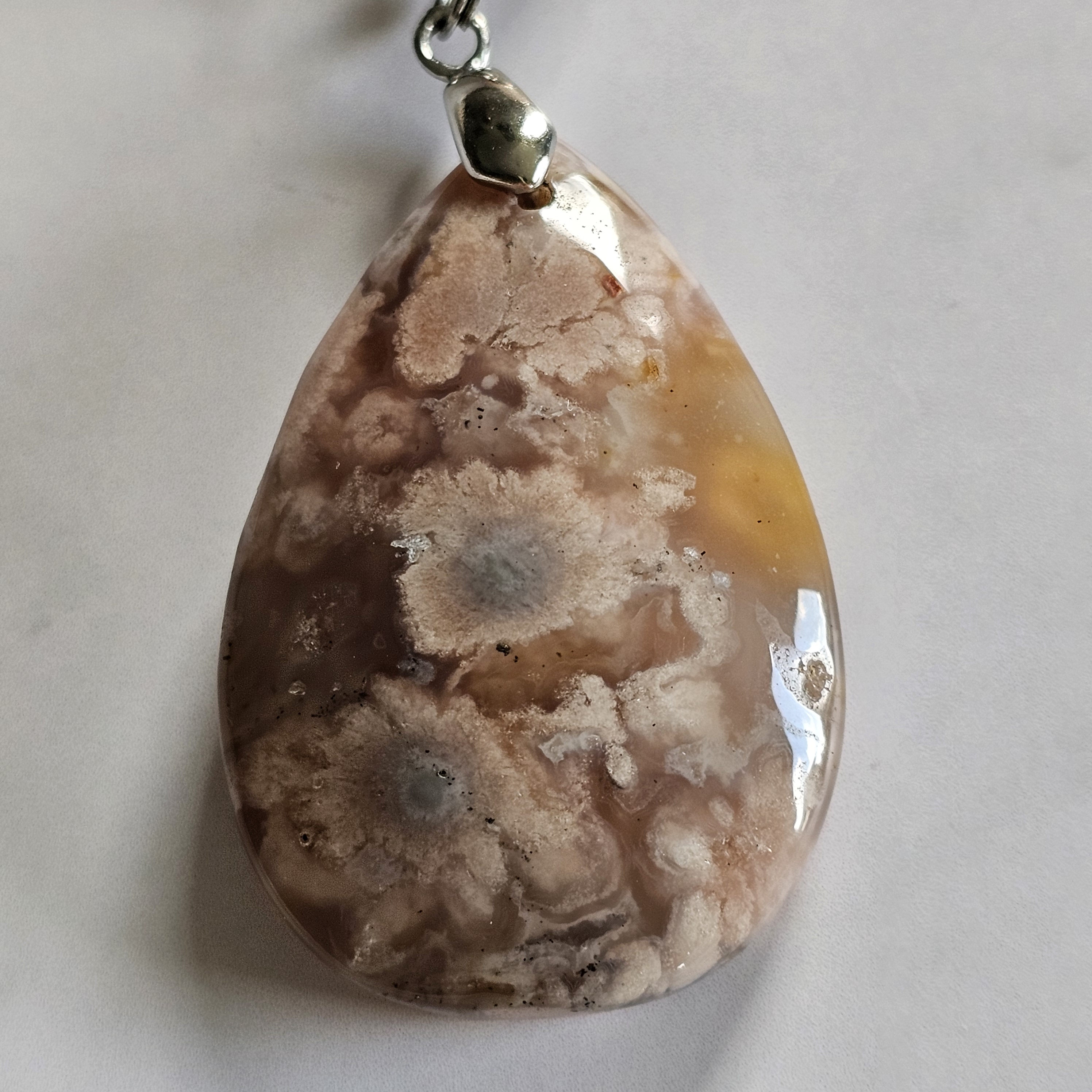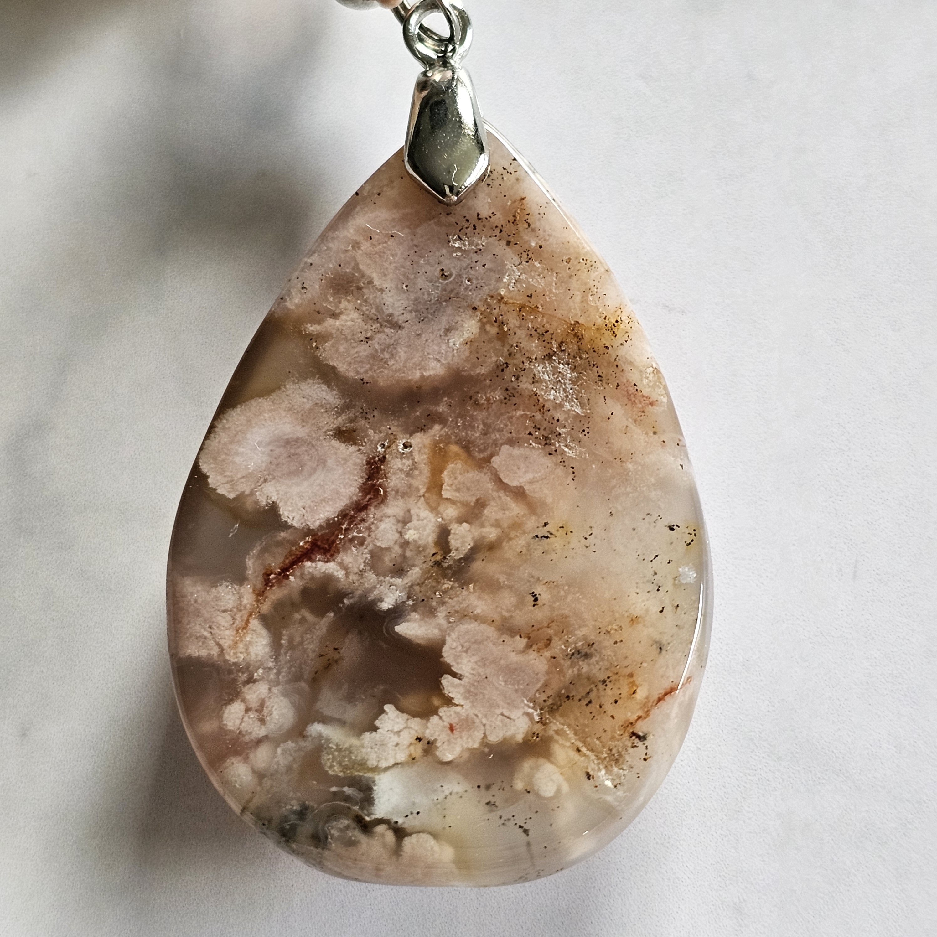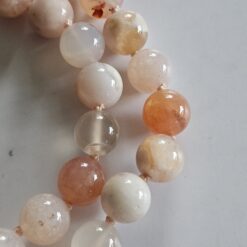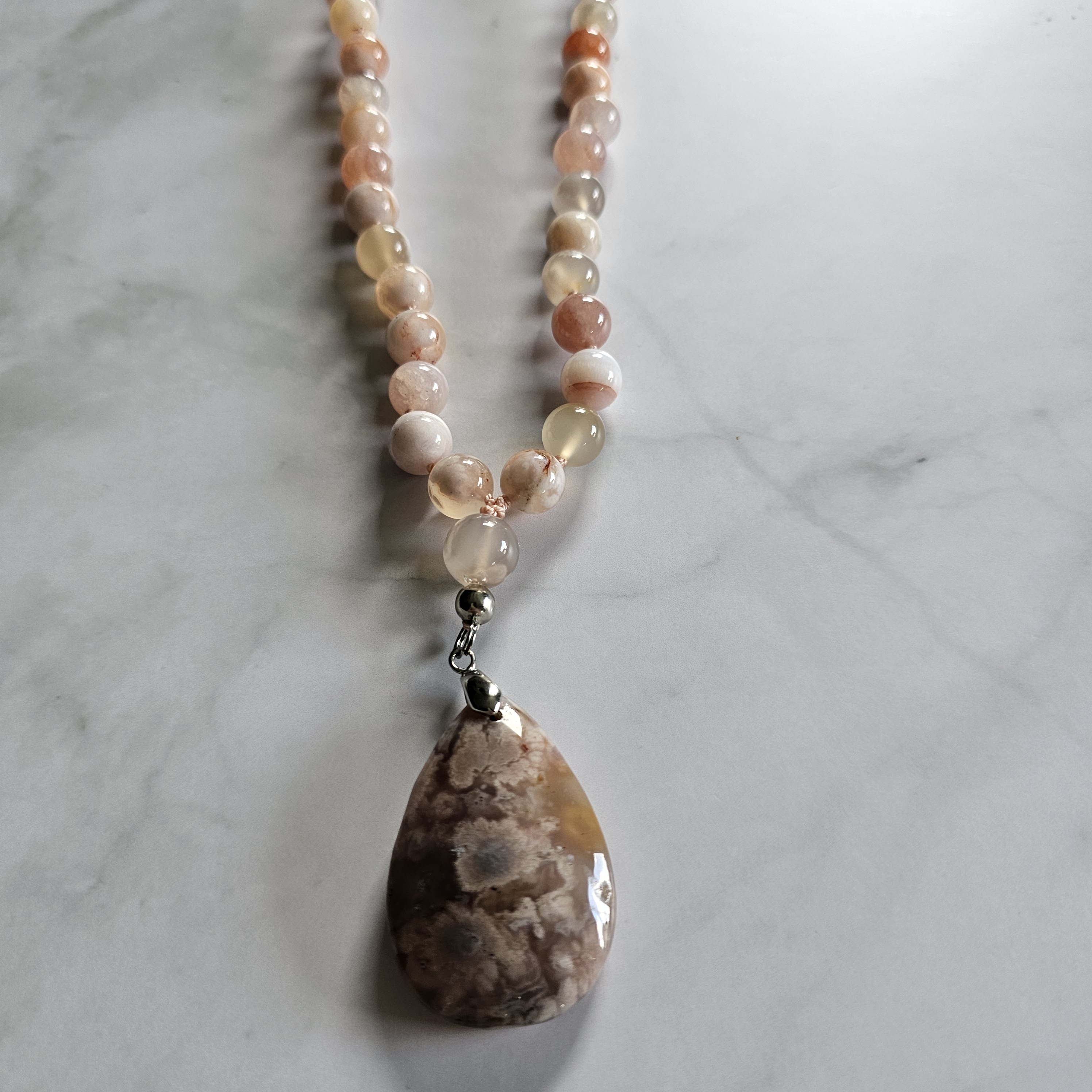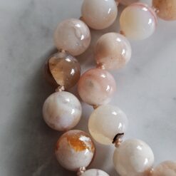 Hier biete ich euch die Achat („Kirschblütenachat“) -Mala (1) mit einem „Kirschblütenachat“-Anhänger (Tropfen) an:
