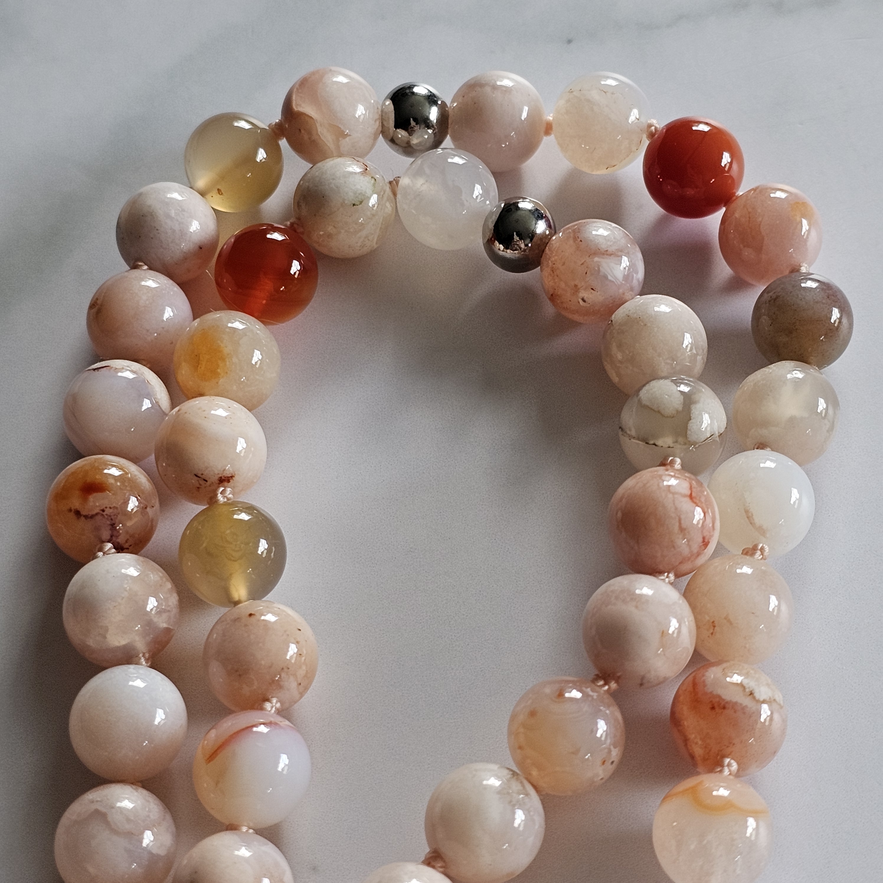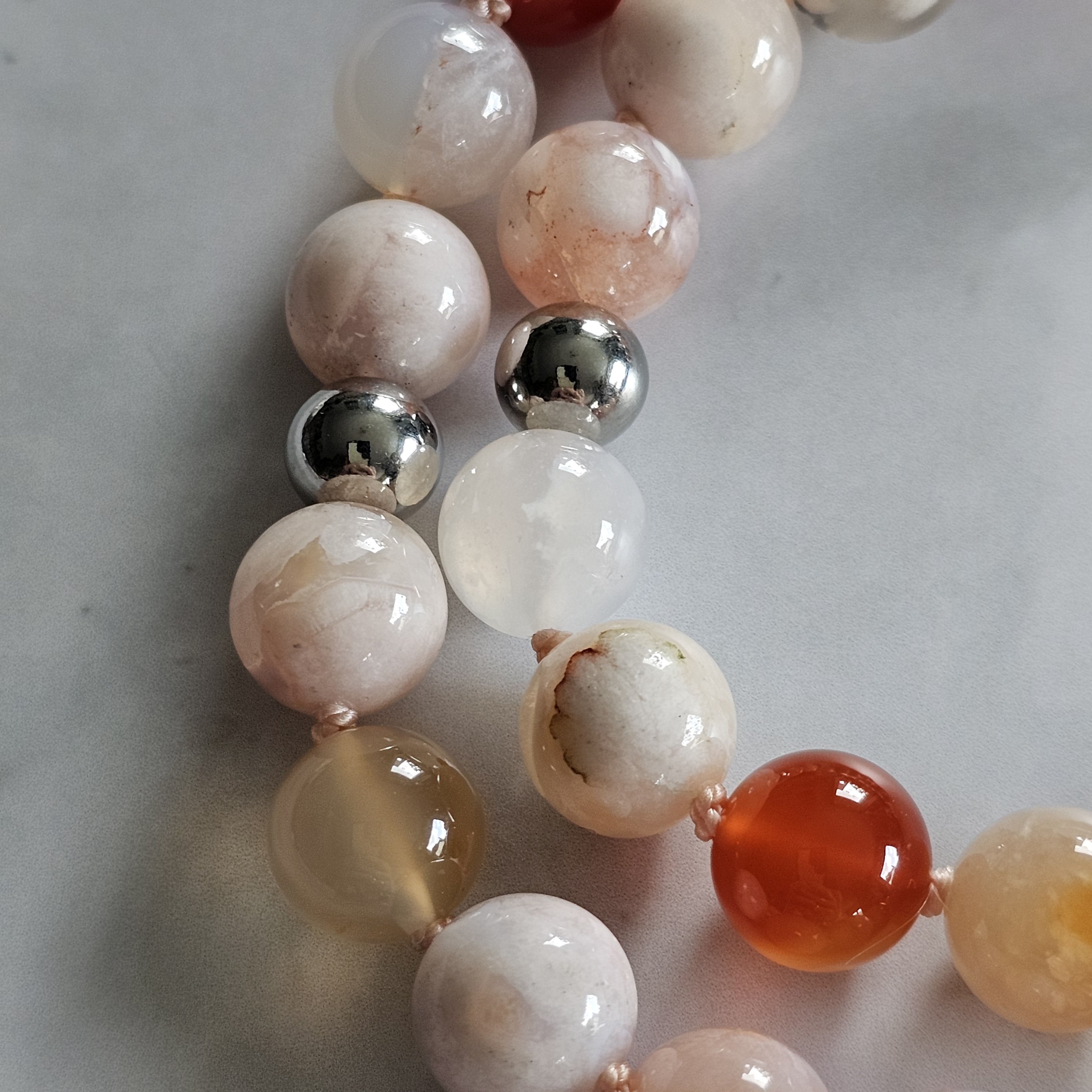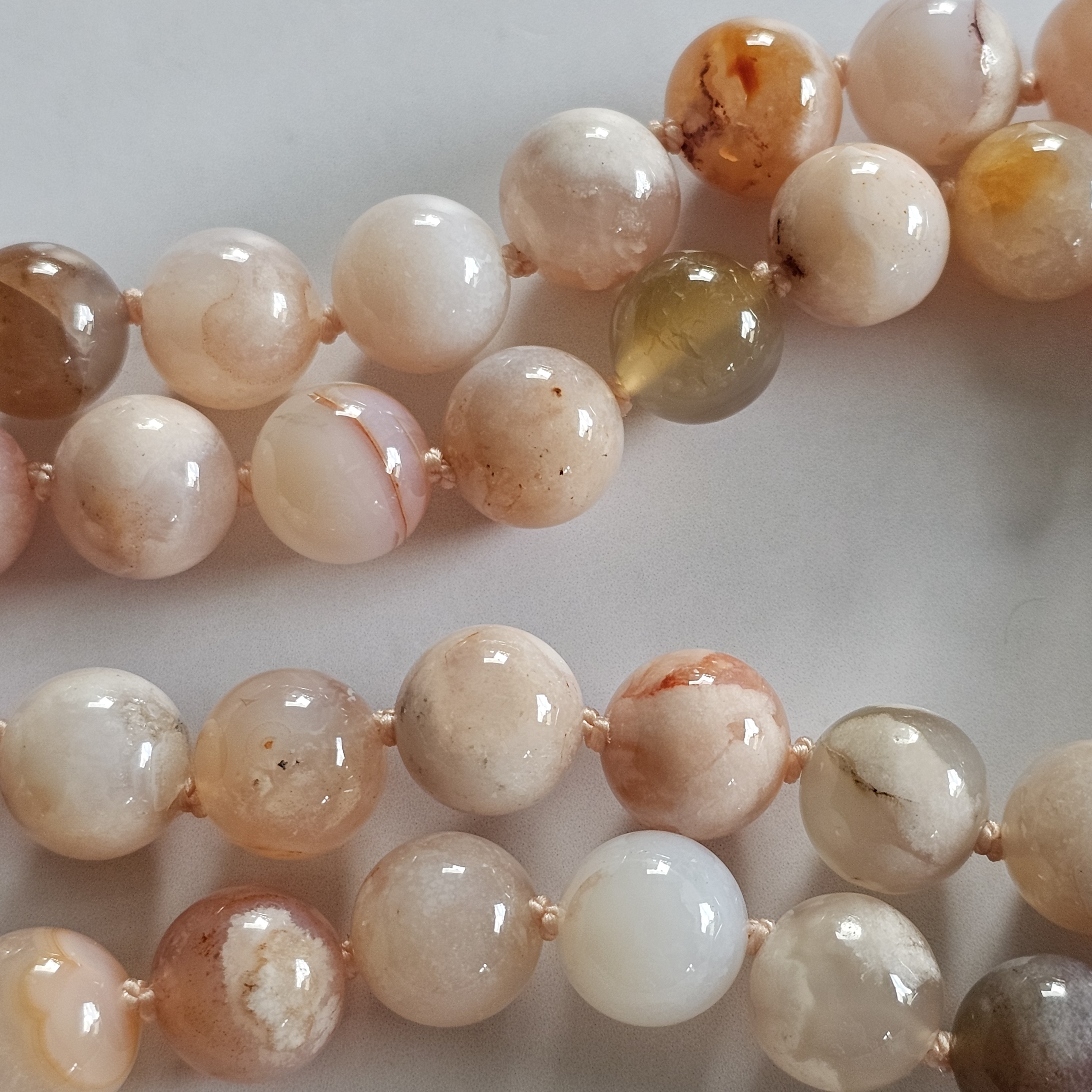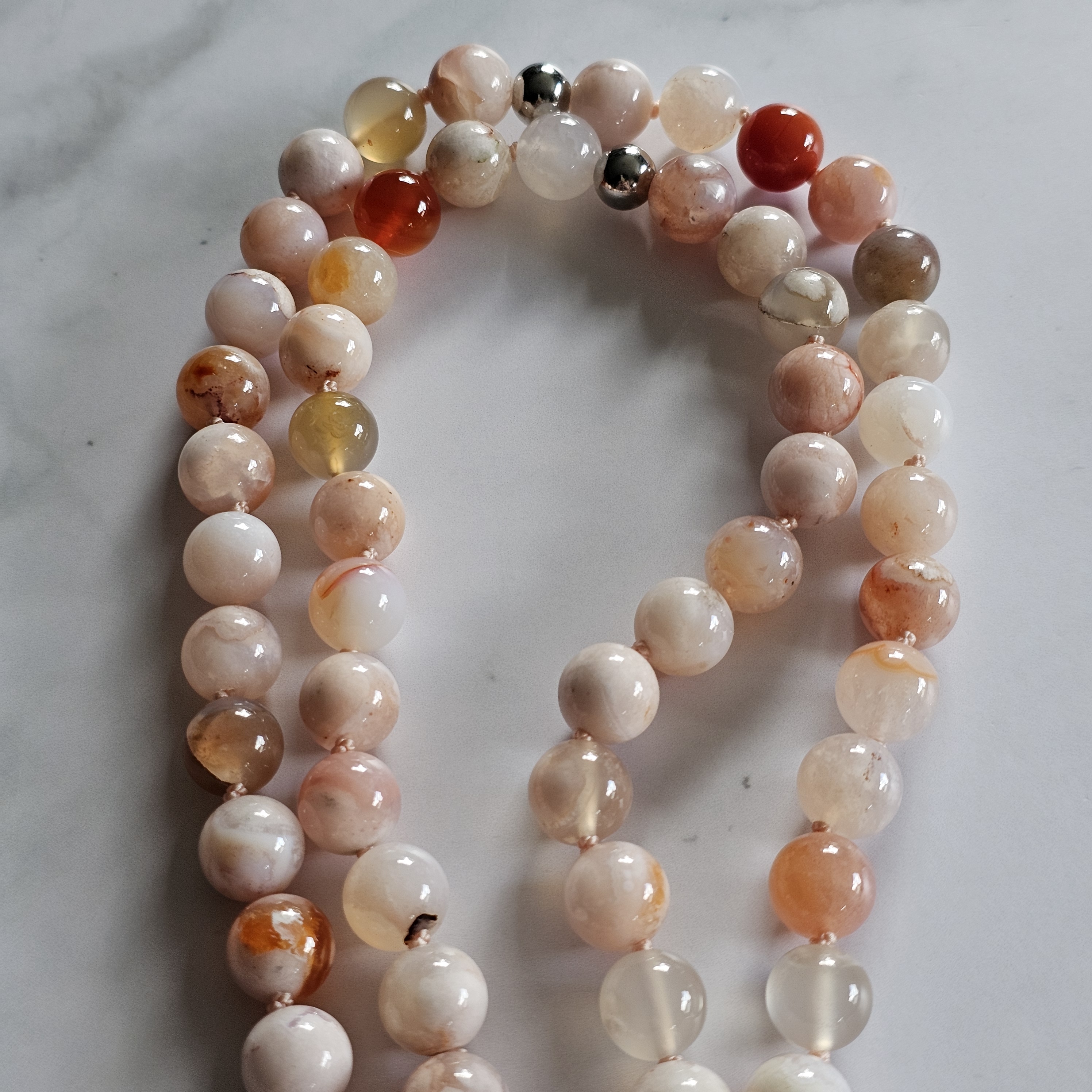 Sie besteht aus 108 10 mm großen „Kirschblütenachat“-Perlen und 2 8 mm großen Perlen aus Edelstahl als Markerperlen.