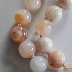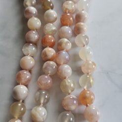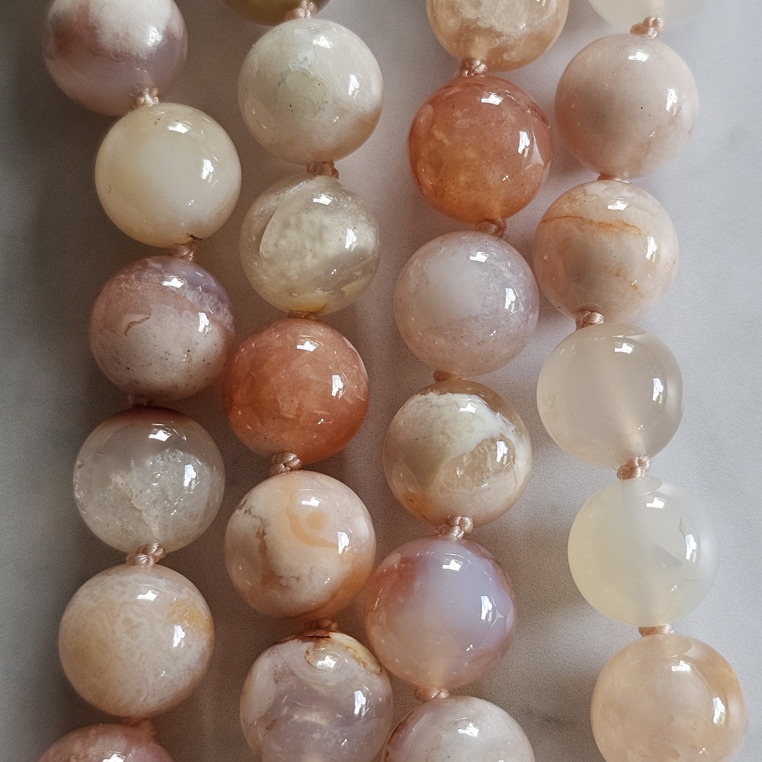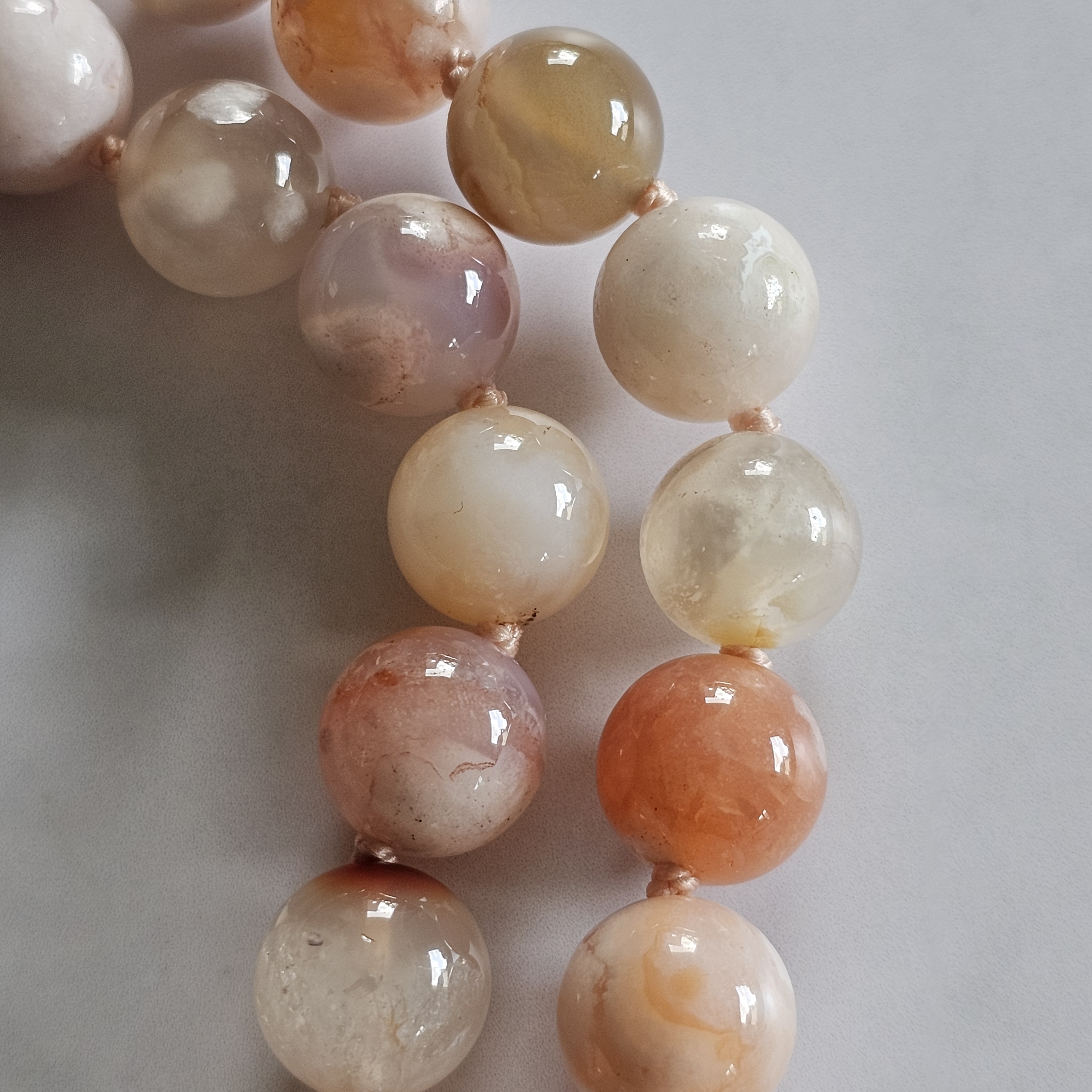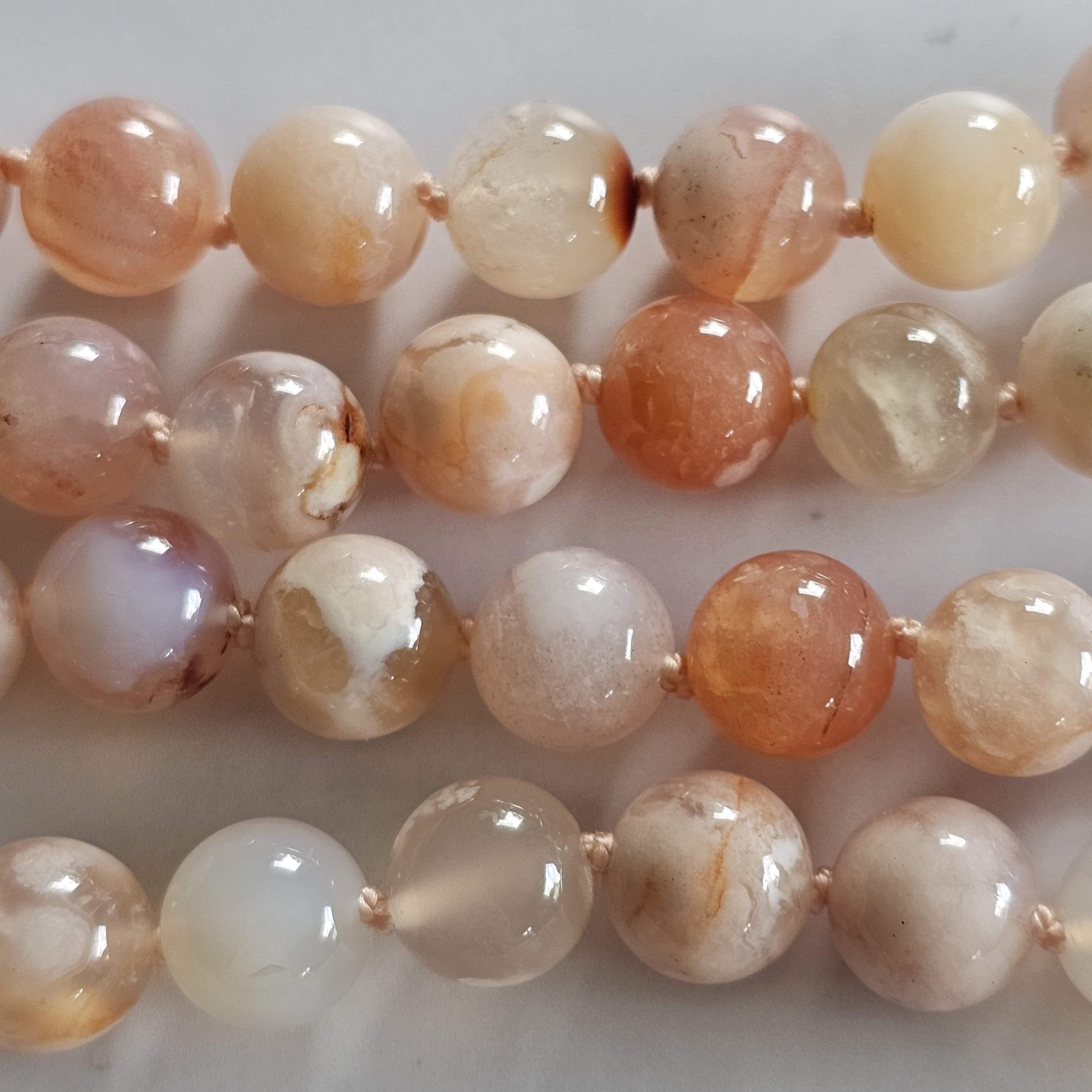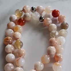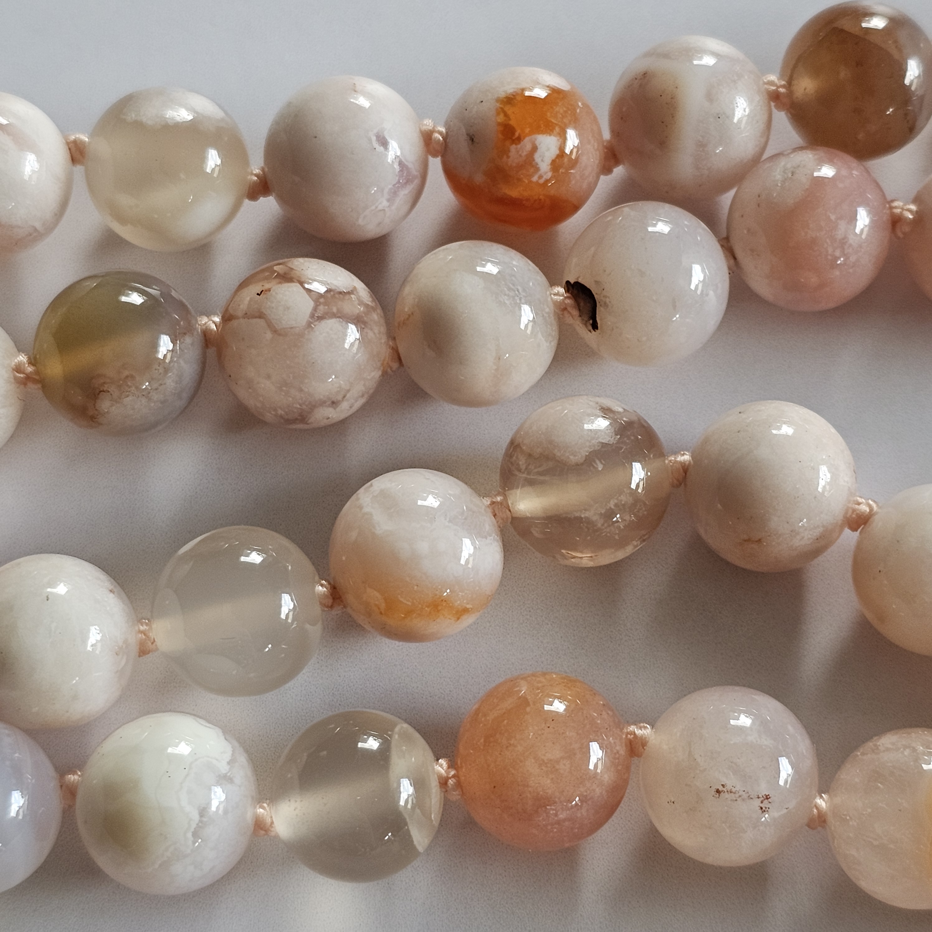 Sie besteht aus 108 10 mm großen „Kirschblütenachat“-Perlen und 2 8 mm großen Perlen aus Edelstahl als Markerperlen.