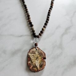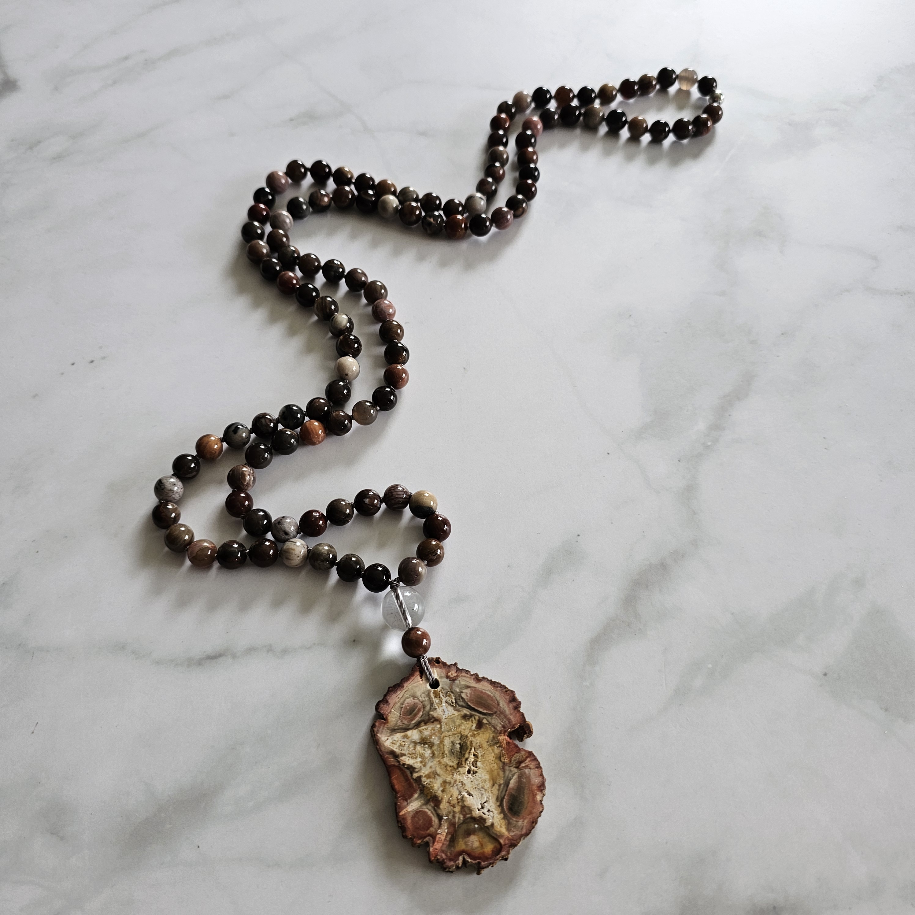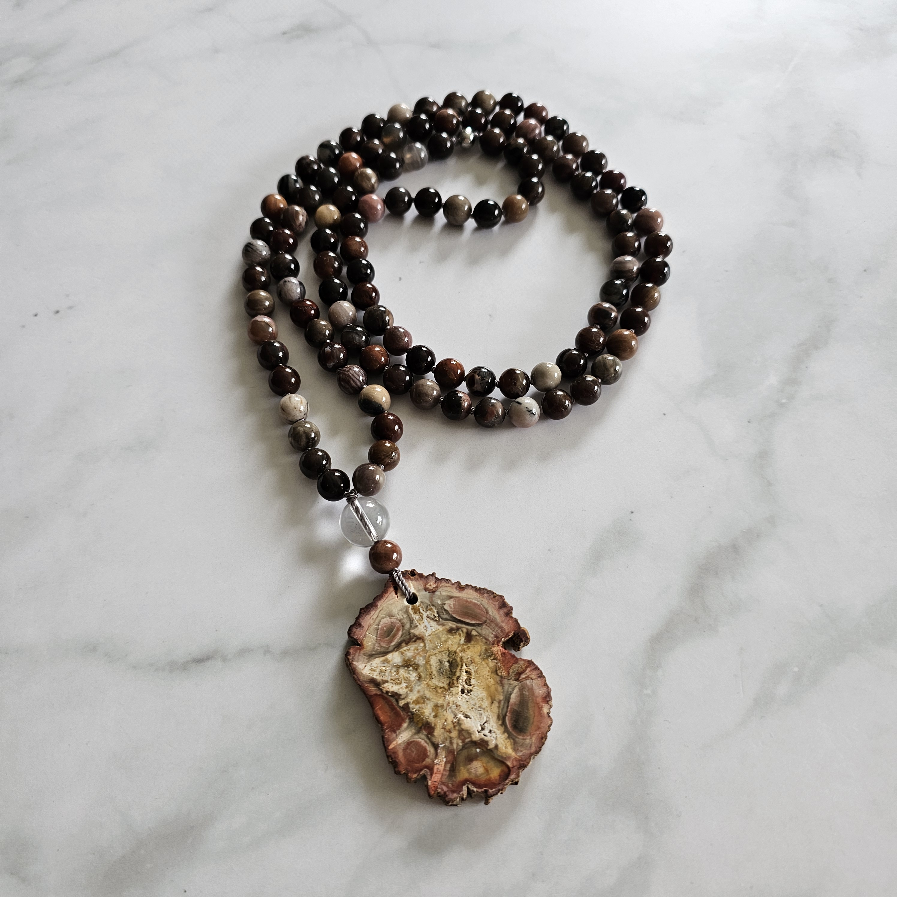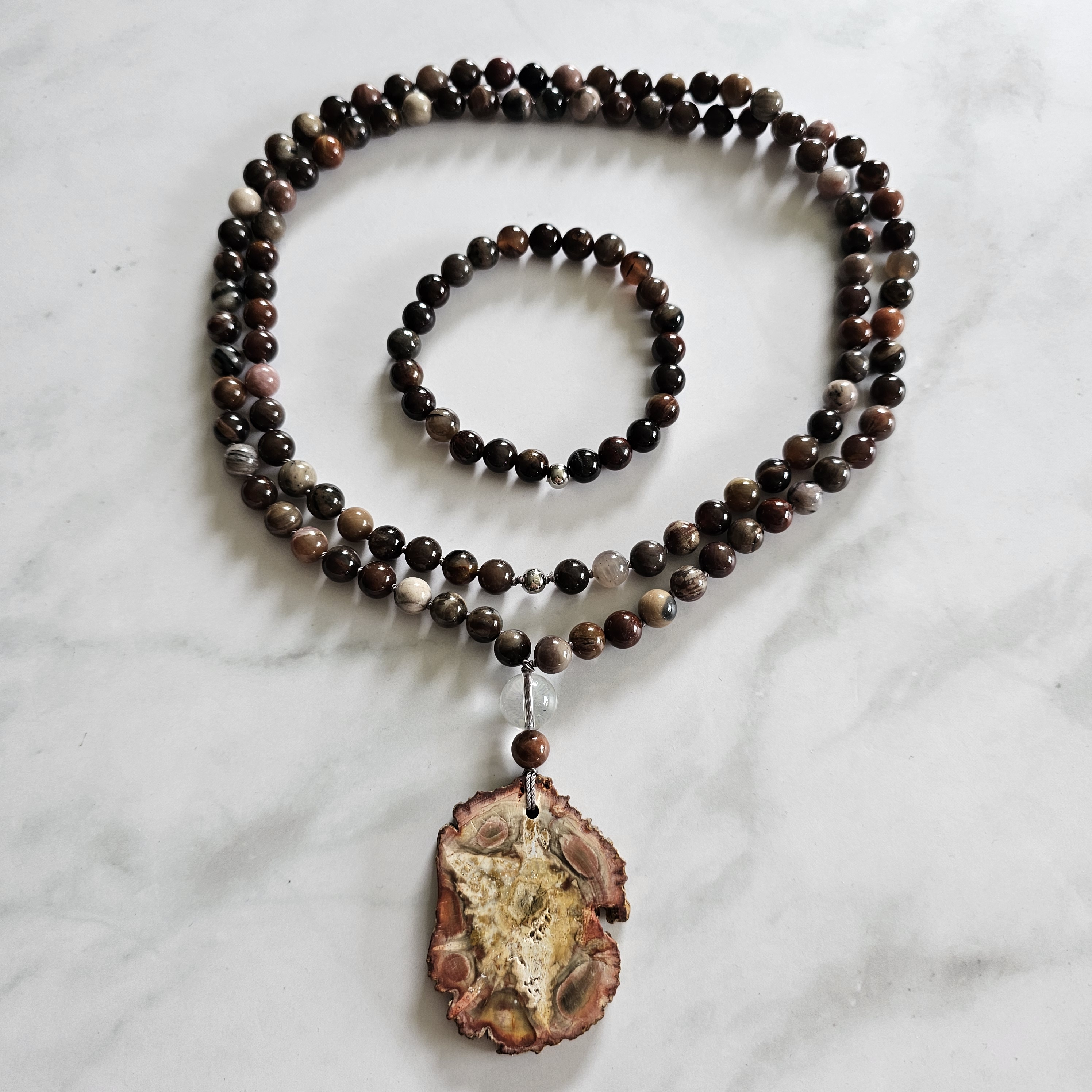 Hier biete ich euch die versteinerte Holz-Mala (3) mit einem größeren, versteinerten Holz-Anhänger (Freiform) und einem passenden Armband an: