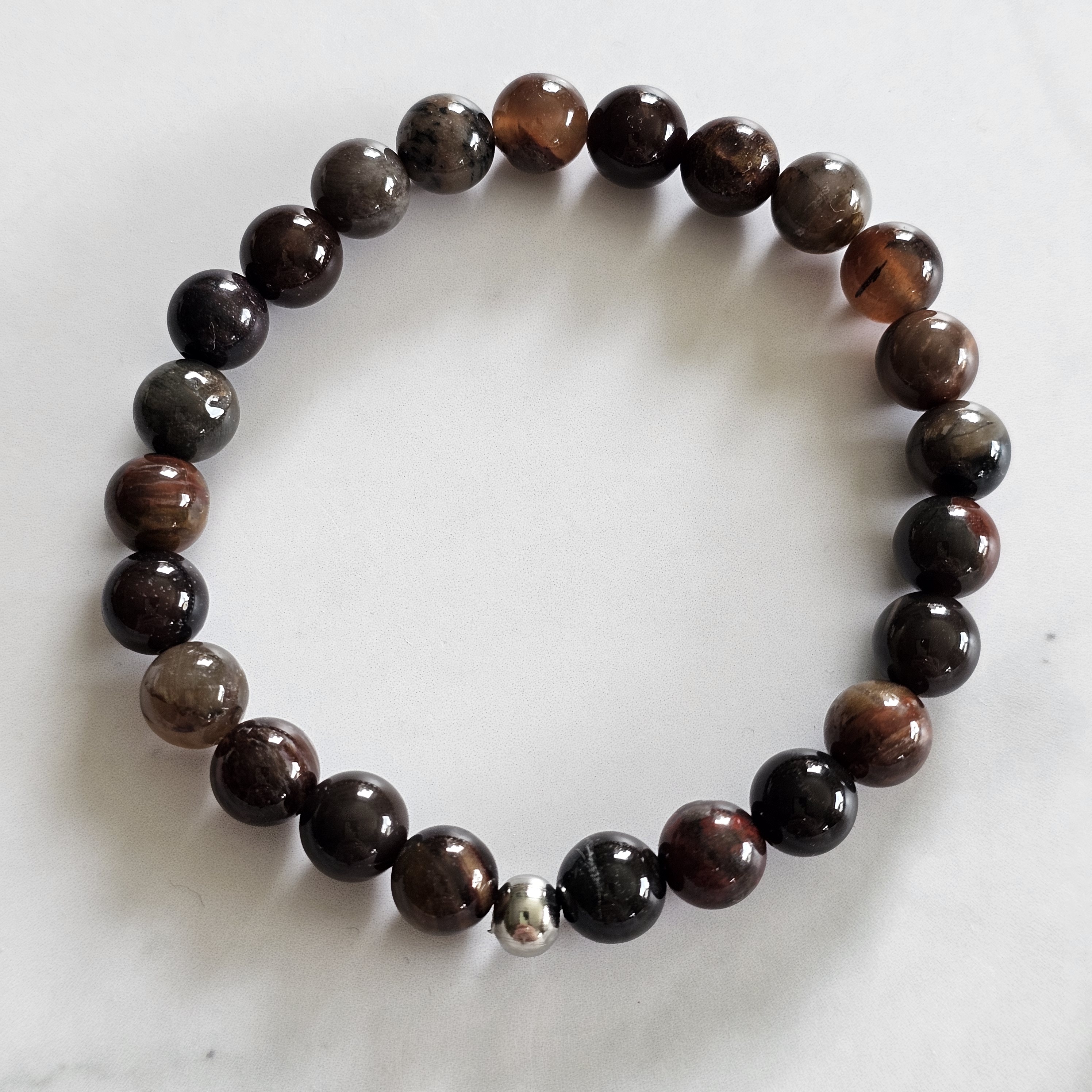 Für das Armband, das ebenfalls aus 8 mm großen, versteinerten Holz-Perlen besteht, habe ich einen hochwertigen Elastikfaden genommen.